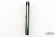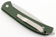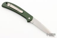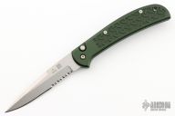 This Falcon Auto by Al Mar Knives has a bead blast finished drop point serrated blade with false top edge. Handle is green anodized aluminum with safety auto button, milled ribs, stainless steel tip up clip, and lanyard hole.  Light scratches are visible on the handle otherwise the knife is in excellent condition.