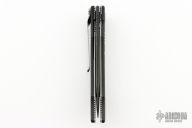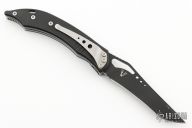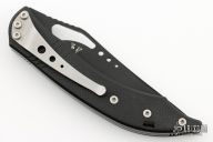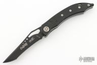 This is a Delta Z Osprey linerlock folder has been converted to a scale release auto by Butch Vallotton. It features a black tanto recurve blade with thumbhole and notched thumbrest. The handle has black G-10 scales, stainless steel liners and tip down clip. Has some scuffs, otherwise excellent condition.