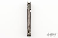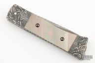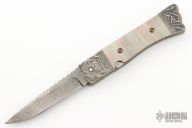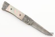 This buttonlock Auto by MS Doane features a drop point Damascus blade with fileworked spine. The handle has mosaic Damascus bolsters, front and rear, pearl scales, anodized screws, and a fileworked stainless backspacer. Nice action and blade seating. Small crack in the pearl, and ding in the frame. Great shape otherwise.