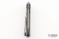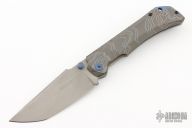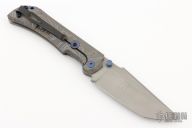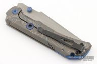 This Usagi framelock from Dervish Knives for Triple Aught Design features a clip point dark grey blade with thumbstud and notched thumbrest. The handle has an anodized and blasted titanium frame with matching backspacer. Tip up stainless deep carry pocket clip. Lanyard hole in backspacer. Nice detent, lockup and blade seating. Comes with a velcro case with patch and COA. Has a couple light scuffs, otherwise excellent condition.