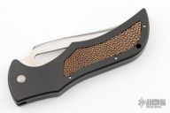 This auto by Gil Hibben features a mirror polished clip point blade. The handle has a black aluminum frame with stingray skin inlays and a lanyard hole at the butt. Nice lockup, action and blade seating. This knife is one of only 10 ever made. Has some light spots, and very fine scratches, excellent condition otherwise.