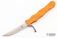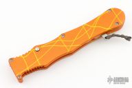 This Mayhem OTF by Rob Dalton features a satin finished upswept blade. The handle is orange/yellow anodized aluminum with charging tab. Comes with box. Has some light scuffs and scratches, great condition otherwise. This color pattern is supposed to be the rarest of the Mayhem models, this is the first one we have had.