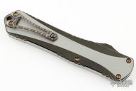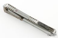 This Manticore X by Heretic Knives features a double-edged Vegas Forge Damascus DLC coated blade. The handle has a two-tone DLC stainless steel frame, carbon fiber thumb slide and a tip down flamed titanium clip with ceramic ball bearing. Comes with original box, zippered case and COA dated 11/21 and s/n 014. Excellent condition.