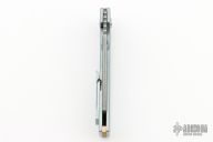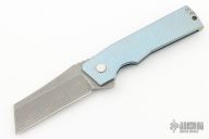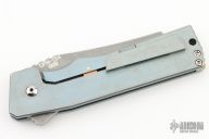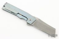 This Framelock Flipper by Ruben's Titanium Tools features a stonewash finished blade with milled bevels, notched thumb ramp and flipper. Milled and anodized titanium frame with a textured front scale and titanium screws and backspacer. Very smooth action that requires no wrist movement. Nice detent, lockup and blade seating. Rides on bearings. Excellent condition otherwise. Marked #009 on the blade. Comes with a zippered case.