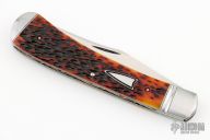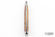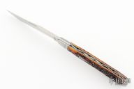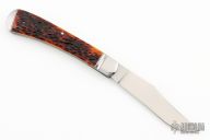 This slipjoint by Tanner Couch features a satin finished blade with nail nick. The handle has threaded and fluted 416 stainless steel bolsters, jigged bone covers with a stainless steel escutcheon, 410 stainless steel liners with fileworked spines and a fully fileworked CPM154 spring. Has half-stop, flush in all positions. Comes with a zippered case and COA. New from maker at the 2023 Blade Show West.