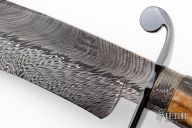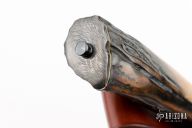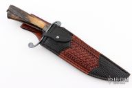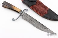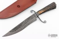 This Take Down Bowie named Hondo by Journeyman Smith Kelly Vermeer Vella features a "Riptide" pattern Damascus blade with a false top edge, .201" blade stock and 1.497" blade depth, hidden tang construction. The handle has a hot blued steel penny guard, the spacers are fileworked and anodized titanium and matching Damascus, beautiful stag grip with a hot blued steel butt and tang nut. Comes with a hand tooled brown leather sheath with shark skin overlay by Paul Long, and a zippered case. New from maker!