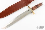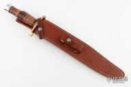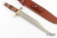 The 13" Randall Thorp Bowie by Randall Made Knives is similar to types used by Confederate troops. This one has an 13" carbon steel blade with sharpened top edge, .198" blade stock and 1.675" blade depth, hidden tang construction. The handle has a lugged brass guard, duralumin butt cap, and a stacked leather grip with red/white/blue spacers. Comes with a brown leather sheath. Has a little patina on the brass, otherwise excellent condition.