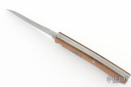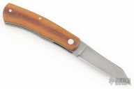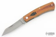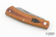 This "Native" pattern custom slipjoint from Jim Dunlap features an etched and hand rub satin finished blade with a nail nick. The handle has vintage brown linen micarta covers with black linen micarta arrowhead escutcheon, stainless steel pins and liners, A2 steel backspacer. Flush in the closed, half stop and open position. Comes with a zippered case. New from maker at the 2023 Blade Show West. Comes with COA.