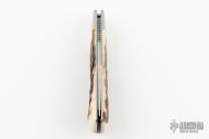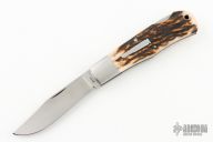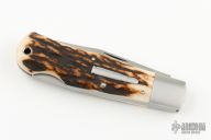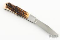 This Lockback by Jim Dunlap features a hand rub satin finished blade with nail nick and notched thumbrest. The handle has stainless steel bolsters, stag scales with stainless steel bullet escutcheon, stainless steel liners and spring. Comes with a zippered case and COA. New from maker at the 2023 Blade Show West.