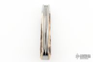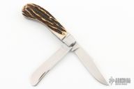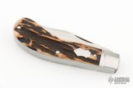 This Slipjoint by Jim Dunlap features a hand rub satin finished blades with nail nicks. The handle has fluted stainless steel bolsters, stag scales with stainless steel shield escutcheon, stainless steel liners and springs. Has half-stops, flush in all positions. Comes with a zippered case and COA. New from maker at the 2023 Blade Show West.
