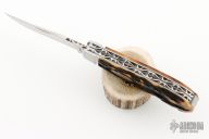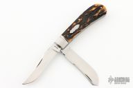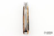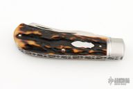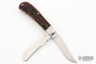 This Slipjoint by Jim Dunlap features a hand rub satin finished blades with nail nicks. The handle has fluted stainless steel bolsters, stag scales with stainless steel escutcheon, stainless steel liners and springs. Fileworked liners and springs. Has half-stops, flush in all positions. Comes with a zippered case and COA. New from maker at the 2023 Blade Show West.