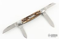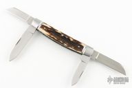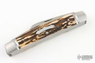 This Slipjoint by Jim Dunlap features a hand rub satin finished blades with nail nicks. The handle has fluted stainless steel bolsters, stag covers with stainless steel escutcheon, stainless steel liners and springs. Has half-stops, flush in all positions. Comes with a zippered case and COA. New from maker at the 2023 Blade Show West.