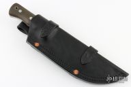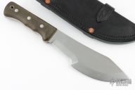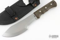 The WSK "Animal" knife by Dave Beck features a hand rub satin finished blade, .241" blade stock and 2.475" blade depth, full tang construction. The handle has green linen micarta scales. Comes with a heavy duty black leather sheath with copper rivets. Excellent condition.