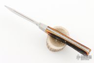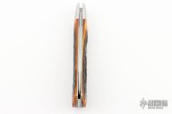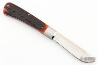 This Trapper by Bobby House features a satin finished blade with long pull nail nick and false top edge. The handle has pinched stainless steel bolsters, stag covers with stainless steel escutcheon, fileworked stainless steel liners and a stainless steel spring. Has half-stop, flush in all positions. Comes with a zippered case. New from maker at the 2023 Blade Show West.