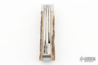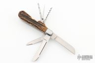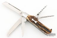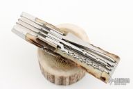 This Slipjoint by Jeff Hawkins features hand rub satin finished blades with nail nick. The handle has stainless steel bolsters, stag covers with a stainless steel escutcheon, stainless steel liners and springs. Has half-stops. The three blades on the back of the knife are a triangle punch, corkscrew and leather auger. Comes with a zippered case. New from maker at the 2023 Blade Show West.