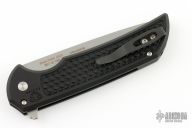 This Mordax by Pro-Tech is a Ferrum Forge design and features a stonewashed drop point blade. The handle has milled a black aluminum frame with black tip up stainless steel clip. Pearl inlaid push button. Comes with original box and papers. New from maker!