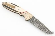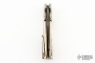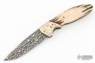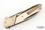 This Model 15 by Jason Clark features a Vegas Forge Honeycomb Pattern Damascus blade with a checkered flipper. The handle has Mokume bolsters, stag scales, blasted and anodized titanium liners, anodized and orange peel, finished tip up pocket clip and a Damascus backspacer. Includes a leather slip sheath with COA. New from maker at the 2023 Blade Show West.