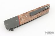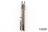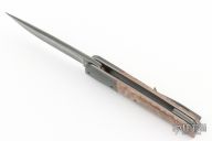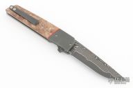This Model 10 by Jason Clark features a Vegas Forge ABE-L Core San Mai Damascus blade with a checkered flipper. The handle has zirconium bolsters, Asian Satinwood burl scales, blasted titanium liners, zirconium tip up pocket clip and a matching Damascus backspacer. Includes a leather slip sheath with COA. New from maker at the 2023 Blade Show West.