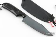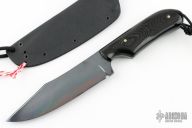 This Baby Army from Fred Perrin features a clip point blade with visible hamon, swedge and notched thumbrest, .151" blade stock and 1.317" blade depth, full tang construction. The handle is comprised of black linen micarta with nickel silver pins. Lanyard hole with lanyard in pommel. Includes kydex sheath. New from maker at the 2023 Blade Show West.