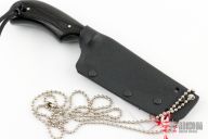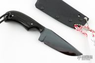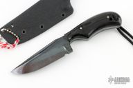This Neck PPF from Fred Perrin features a blued clip point blade with visible hamon, swedge and notched thumbrest, .142" blade stock and .971" blade depth, full tang construction. The handle is comprised of black linen micarta with nickel silver pins. Lanyard hole with lanyard in pommel. Includes kydex sheath. New from maker at the 2023 Blade Show West.