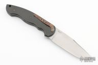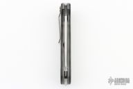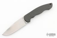 This Linerlock flipper by Thierry Savidan features a hand rub satin finished blade with false top edge and a flipper. The handle has carbon fiber scales, tip down anodized titanium clip, stainless steel backspacer, lanyard hole, blasted titanium liners. Rides on IKBS bearings, nice detent, lockup and blade seating. Comes with zippered case and card. Excellent condition.