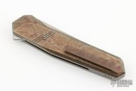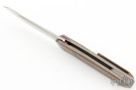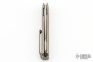This No Screw Linerlock Flipper by Kniff features a two-tone blade with flipper. The handle has an anodized titanium frame with matching tip up clip and bead blasted titanium backspacer. Nice detent, lockup and blade seating. Rides on bearings. Comes with a leather slip sheath. New from maker at the 2023 Blade Show West. This knife is marked Prototype. It has no visible screws.