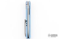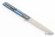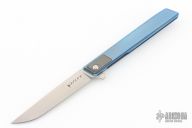 This Framelock Flipper by Kniff features a matte finished blade with notched flipper. The handle has an integral anodized titanium frame with zirconium inlaid bolsters and tip up clip and stainless steel lockface insert. Nice detent, lockup and blade seating. Rides on bearings. Comes with a leather slip sheath. New from maker at the 2023 Blade Show West. This knife is marked Prototype.