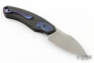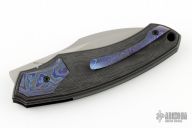 This Davless Knife by David Lespect was produced by Custom Knife Factory. It features a beadblast finish S90V blade with swedge and notched thumbrest, front flipper style opening. The handle has Titanium frame, milled carbon fiber scales with DarkTi inlay, and DarkTi tip up clip. Rides on bearings, nice detent, lockup and blade seating. Comes with original pouch and COA dated 6/2023. Excellent Condition.   #18