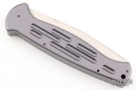 This XL AFO side-opening automatic from Rob Dalton features a satin finished blade with false top edge. The handle has an anodized aluminum frame. Strong and fast coil spring action, nice function. Has a couple of very light scratches, the blade doesn't sit all the way down in the trough when close, otherwise good condition.