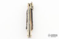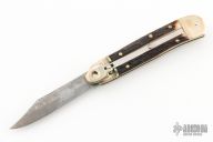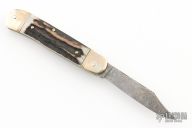 This Lever Lock Automatic by Hubertus Knives features a Damascus blade with fileworked spine. The handle is comprised of nickel silver double bolster and lever with stag scales over brass liners and steel backspacer. Has some light scratches, otherwise excellent condition.