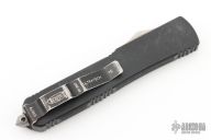 This Ultratech Hellhound Tanto by Microtech features a satin finished tanto blade with partial serrations. The handle is black aluminum and carbon fiber with a black steel tip down pocket clip.   S/N 01979.  Dated 03/2007.  Scuffs and scratches are visible otherwise the knife is in working condition.  This knife would make a great user.