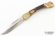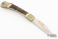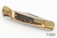 This Puma Prince lockback Auto features a satin finished blade with a single nail nick and notched thumbstud.  The handle features a brass frame, stag scales and a steel backspacer. Still has original Rockwell sticker. Excellent Condition.   #31791