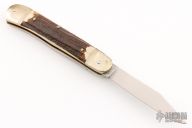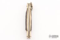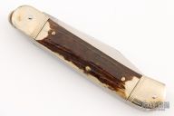 This Lever Lock Automatic by Hubertus Knives features a polished clip point blade. The handle is comprised of nickel silver double bolster and lever with stag scales over brass liners and steel backspacer. Has some light scratches, otherwise excellent condition.