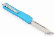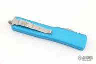This UTX-70 OTF automatic features a stonewash finish tanto blade with a standard edge. Blue aluminum frame with Stainless steel clip. Dated 06/2019 and serial number 4636. Excellent Condition.