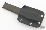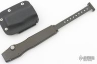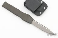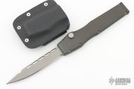 This HALO II is the clip point blade model in the HALO series by Microtech Knives. Single action, side positioned button for firing. Closure via a reverse charging handle in the rear of the frame. Contoured frame grip with milled ribbing on the frame spine and belly. This Halo II has a bead blasted clip point blade. Dated 03/98. Kydex belt sheath. Has some light scuffs, otherwise excellent condition.