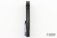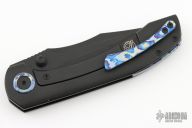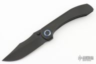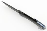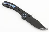 This Raptor by Brian Brown features a black PVD tumble finished blade with dual thumbstuds and notched thumbrest. The handle has a black PVD tumbled titanium frame with MokuTi pivot collars, tip up clip and backspacer. Comes with a zippered case and original box. Excellent condition.