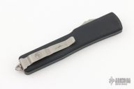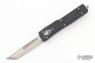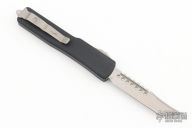 This UTX-70 OTF automatic by Microtech features a Hellhound blade. The handle has a black aluminum frame with blasted stainless steel tip down clip. Dated 01/2019. Excellent Condition.