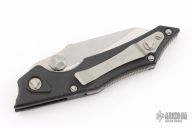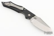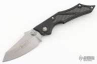 This Select Fire M/A Linerlock by Microtech features a stonewashed drop point blade with swedge, notched thumb ramp and machined thumb studs. The handle is comprised of a black anodized aluminum frame with carbon fiber inlays over a stonewashed backspacer. The steel pocket clip is positioned for tip up carry. Has scuffs and scratches otherwise good condition.  Would make a great user.