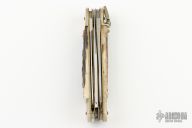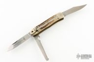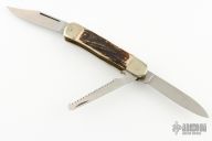 This Leverlock Auto by Hubertus Knives features a mirror polished stainless steel main blade and satin finished secondary blades with nail nicks. Handle has stag scales with nickel silver bolsters over brass liners. Has 2 other blades, one is a saw the other a clip point. Both of these blades are slipjoints. Great action and lockup. Has some scratches, otherwise excellent condition.