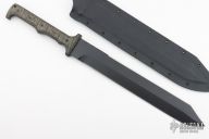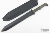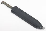 This M-4 by Miller Bros Blades features a black double edged blade with a fileworked blade spine, .360" blade stock 2.320" blade depth, full tang construction. The handle has green/black G-10 scales, lanyard holes.  Comes with a kydex sheath. Excellent condition.