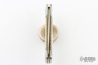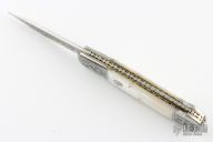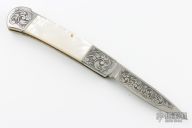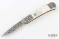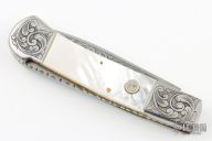 This custom D/A Auto by Mel Fassio features a hand rub satin finished blade with engraving. The handle has engraved dovetailed stainless steel bolsters, mother of pearl scales with fileworked brass liners, brass liners, fileworked stainless steel backspacer, engraved nickel silver push button. Has nice action. The handle has some small gaps in the handle. Has some light scratches, otherwise good condition.