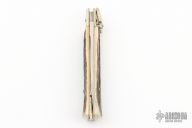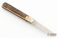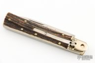 This Lever Lock Automatic by Hubertus Knives features a polished drop point blade. The handle is comprised of nickel silver bolster and lever with stag scales over brass liners and steel backspacer. Has some light scratches, otherwise excellent condition.