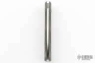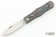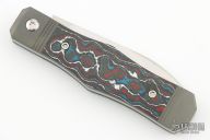This Vampire Jack is a Coffin slipjoint model by Jack Wolf Knives featuring a satin finished drop point blade with nailnick. The handle has integral bead blast finish pinched and fluted titanium front and rear bolsters and liners, fat carbon scales with a stainless spring. Comes with box, metallic tube with J. Gonzo artwork, leather slip, sticker and microfiber cleaning cloth. New from Maker.