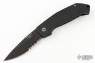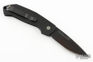 The Protech Magic 2 is a Mike "Whiskers" Allen design, scale release automatic knife. This knife has a black partially serrated blade and a black 6061-T6 aluminum handle with a black stainless steel tip up clip. The automatic opening blade is activated by pivoting the top scale at the bottom of the handle. Pivot the scale again to release and close the blade. #236. Excellent condition. Comes with original box and papers.