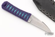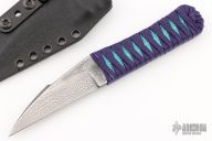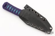 This REV by Auxiliary Manufacturing features a Damscus blade .190" blade stock and 1.009" blade depth. The handle has epoxied purple cord wrap over dyed ray skin. Includes a kydex sheath, the original box and papers. New from Maker!