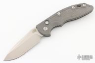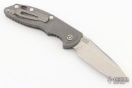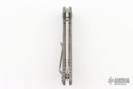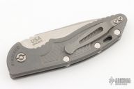 This XM-18 Flipper by Rick Hinderer Knives features a 3.5" stonewashed finish blade, notched thumbrest and flipper.  The handle has a working finished titanium frame with a matching tip up pocket clip.  Comes with original box and papers. New condition.