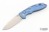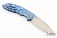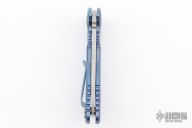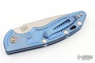 This XM-18 Flipper by Rick Hinderer Knives features a 3.5" stonewashed finish blade, notched thumbrest and flipper.  The handle has a blue stonewashed titanium frame with a matching tip up pocket clip.  Comes with original box and papers. New condition.