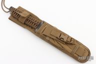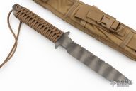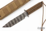 The BN-SS by Strider features a tiger stripe tanto blade with a serrated top edge .248" blade stock and 1.490" blade depth, full tang construction. The handle has a green paracord wrapped handle. Comes with a tan nylon sheath. New condition.