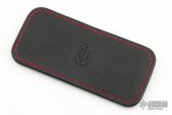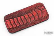 This leather slip sheath by Robertson Leather Works features Red Ostrich Leg Skin. It is 4.75" long by 2.25" wide. New from maker at the 2023 Blade Show West.