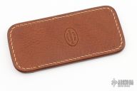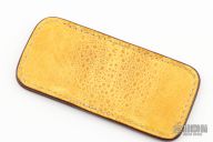 This leather slip sheath by Robertson Leather Works features Yellow Cane Toad skin. It is 4.75" long by 2.25" wide. New from maker at the 2023 Blade Show West.